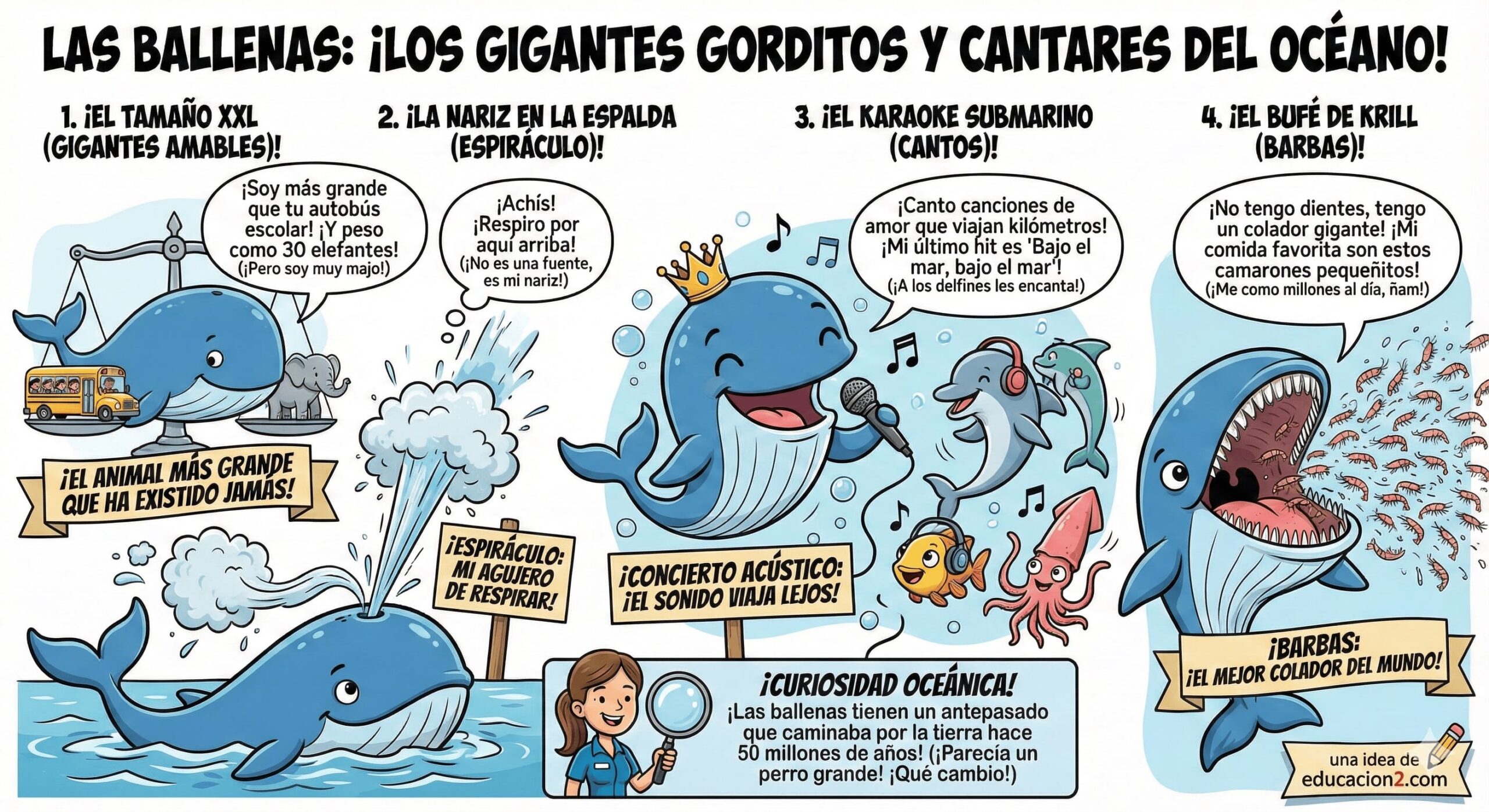 Si alguna vez has visto una ballena en un documental o en una ilustración infantil, quizá te haya parecido un animal casi de fantasía: enorme, con una “nariz” que lanza chorros de agua y capaz de cantar bajo el mar. Pero las ballenas son muy reales, viven en todos los océanos del planeta y cumplen un papel clave en la salud del medio marino. Vamos a conocerlas mejor con ojos curiosos y mente de niño, pero con datos científicos de verdad.